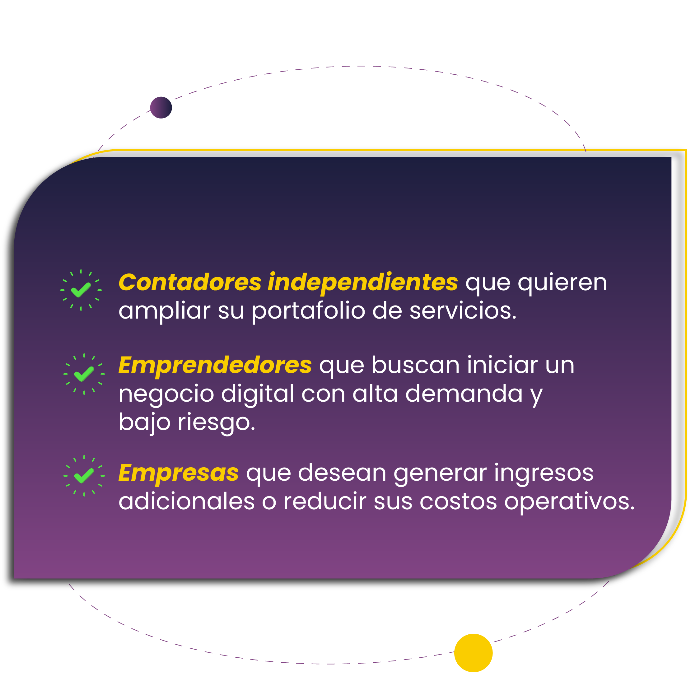 Queremos ser el puente que conecta a los emprendedores con oportunidades en el mercado de facturación electrónica, ayudándolos a construir negocios digitales, rentables, sostenibles y escalables.
